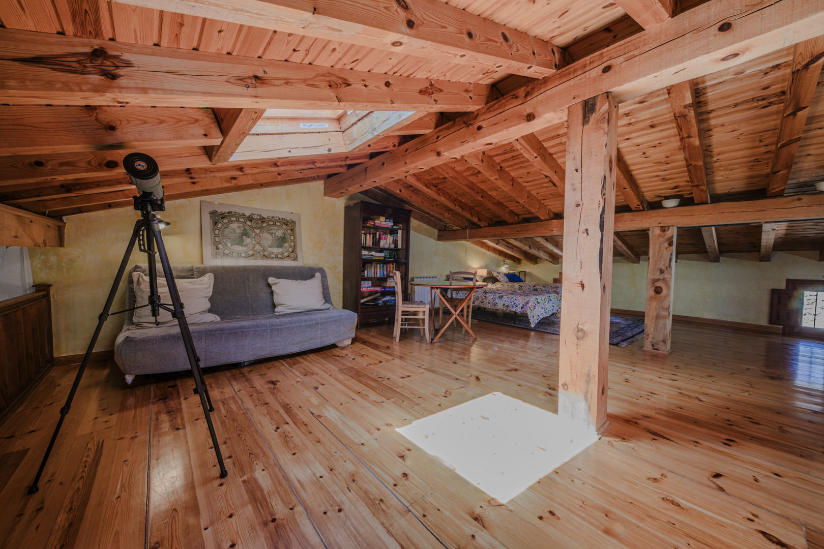 En la buhardilla se encuentra un amplio espacio de 90 m². Es un espacio versátil y luminoso, con dos camas individuales y un sofá cama para dos personas, que puede funcionar tanto como dormitorio como sala de ocio o de relax.